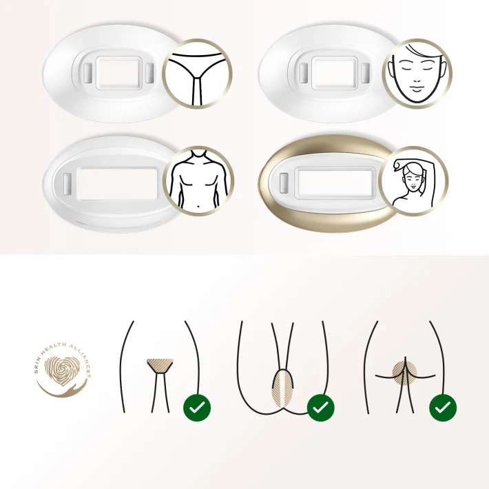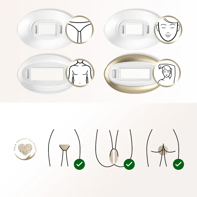 Normál, precíziós és széles fejek a teljes testre kiterjedő kezeléshez – a lábaktól, karoktól, a mellkastól a háton át az arcig, a hónaljig és a bikinivonalig.