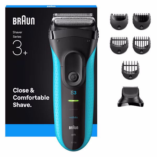 Alapos és kellemes borotválkozás: A Series 3+ borotva 2 Braun szitás vágóelemmel és 1 középső trimmelővel rendelkezik a hosszabb szőrszálak borotválásához.