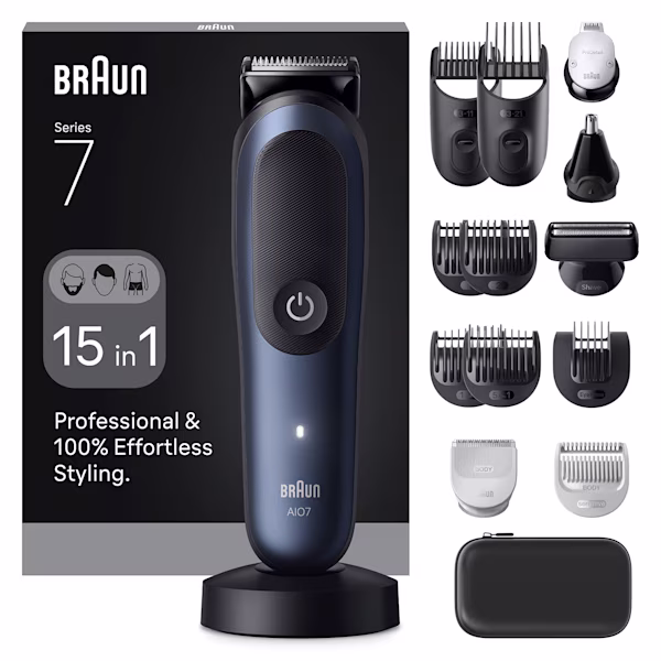 Professzionális és 100%-ban gördülékeny formázás: Braun 15 az 1-ben formázókészlet – szőrtelenítés tetőtől talpig: válogatott eszközök szakállvágáshoz, az orr- és fülszőr eltávolításához, hajvágáshoz és az egész test testszőrzetápolásához.